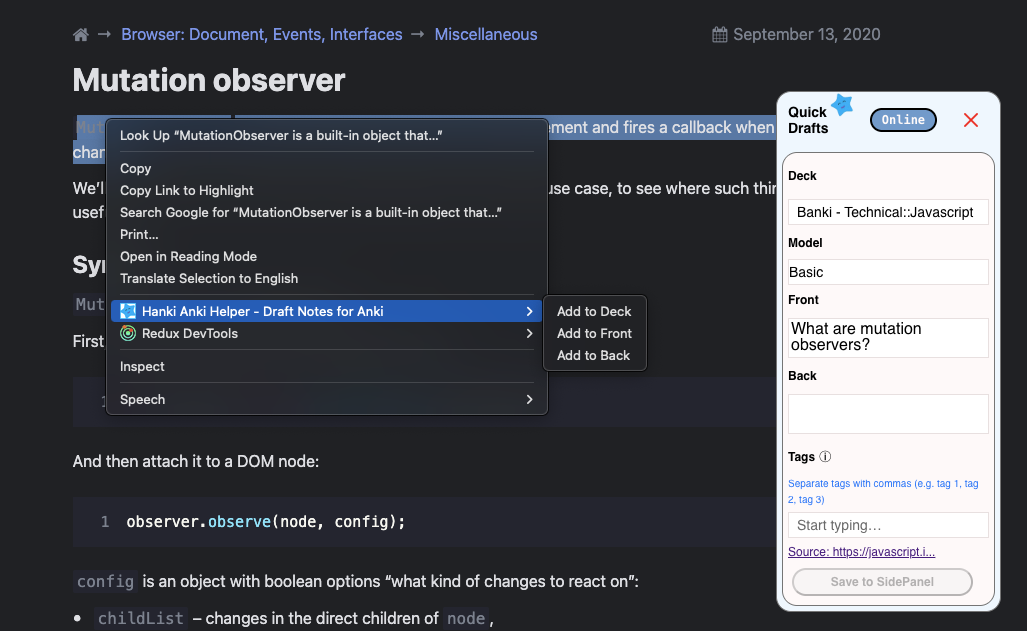 Learn more about AnkiWebHanki Helper uses AnkiConnect to sync your drafts into Anki - AnkiConnect runs locally on your computer. Cards are only sent when you click Sync